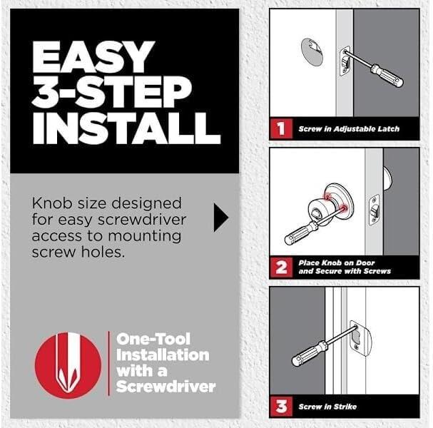 BOX INCLUDES: Exterior and Interior Knobs, Screws, Adjustable Latch, Strike Plate, Emergency Unlock Tool, Installation Hardware, Install Guide