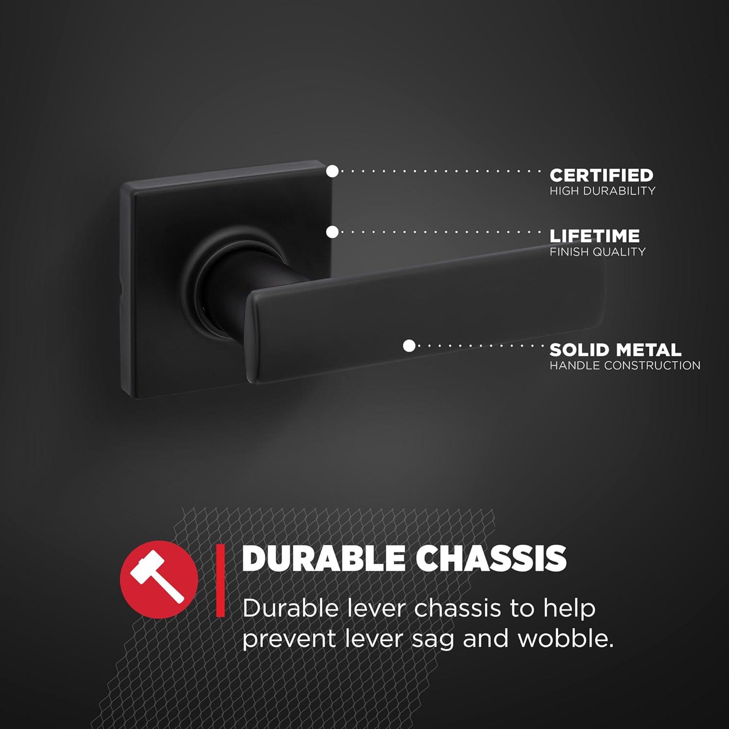 As the industry leader, Kwikset has provided trusted security for over 70 years and has become synonymous with security, peace of mind, style and innovation. The Breton Lever combines the strength and durability of a Kwikset product in stylish & contemporary design. The contours of the lever makes it feel comfortable without sacrificing features. Available with Smartkey Security and Microban on select finishes. It comes in either a round or a square rose, providing alluring aesthetics. This passage knob/lever is best used on interior hall and closet applications where no locking is required, so the knob/lever is always free to turn. The knob/lever is reversible and mounts on both left and right handed doors. The rich tones of Matte Black add the finishing touch to this product. The Matte Black finish provides a rich and warm complement to the product’s style.