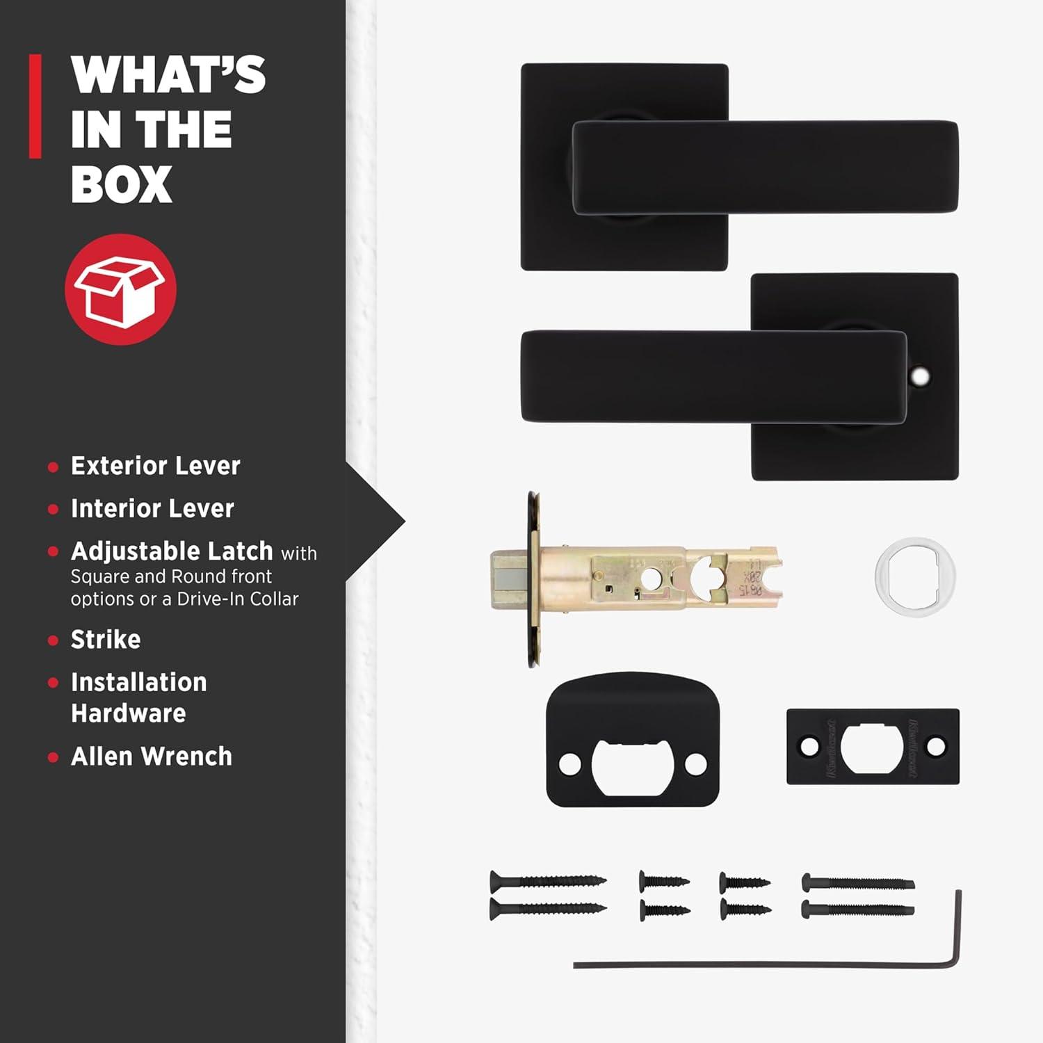 BOX INCLUDES: Passage lever, adjustable latch with round and square front options or drive-in collar, round corner strike, rosette, screws and Allen wrench