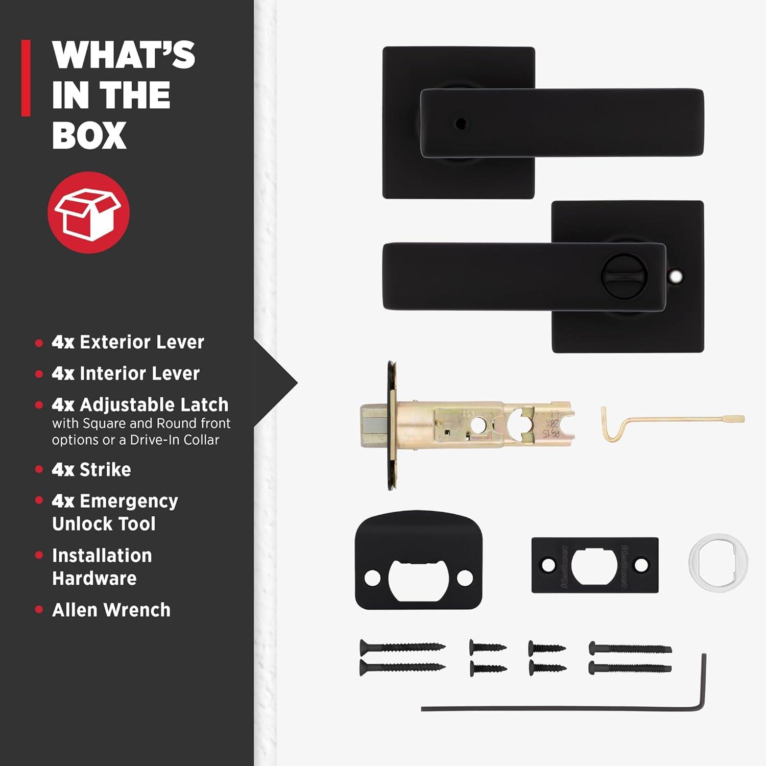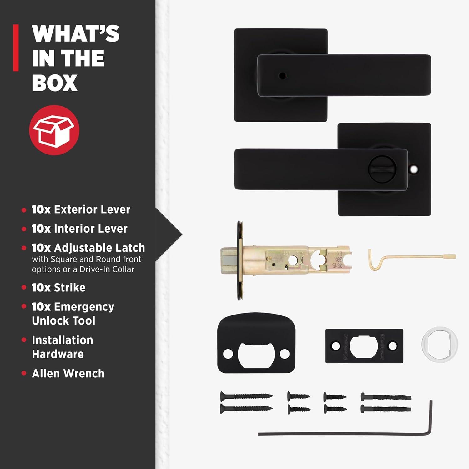 BOX INCLUDES: 4 Privacy levers, adjustable latch with round and square front options or drive-in collar, round corner strike, rosette, screws and Allen wrench