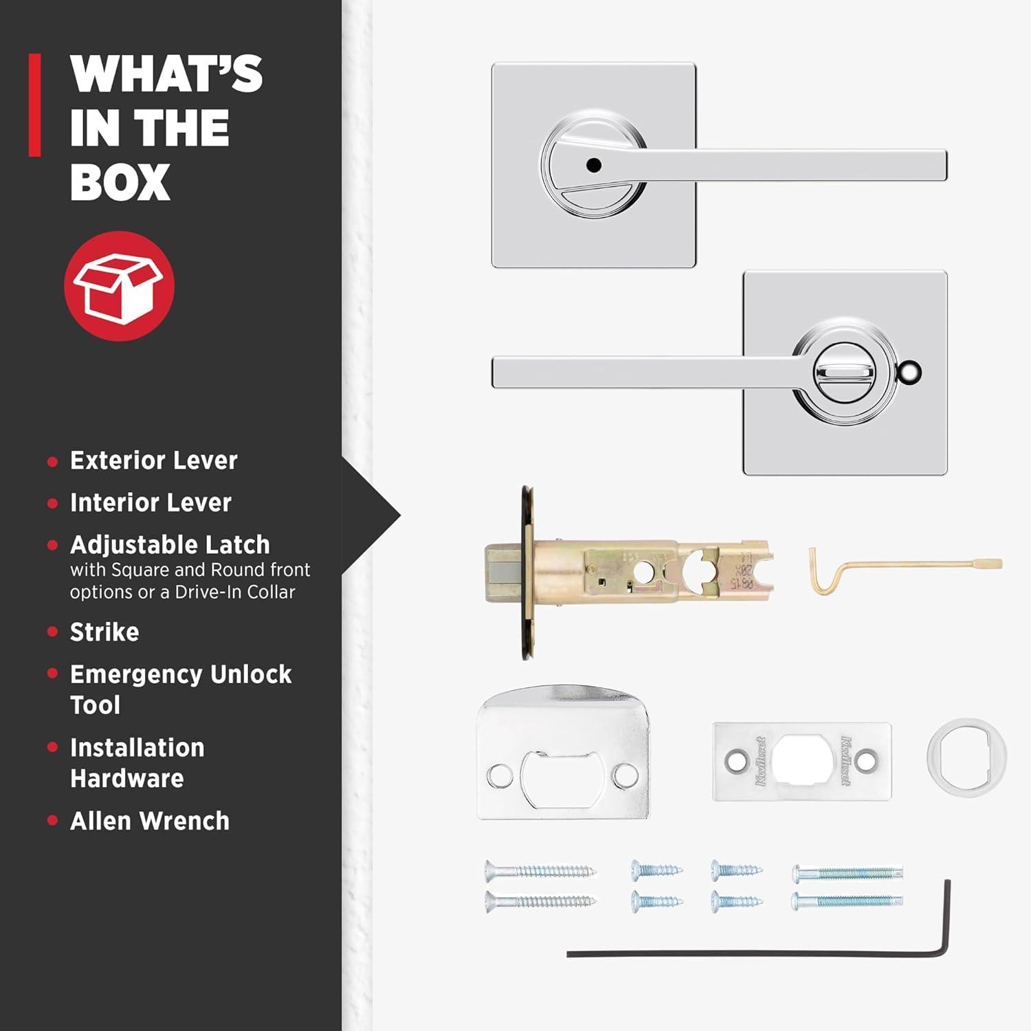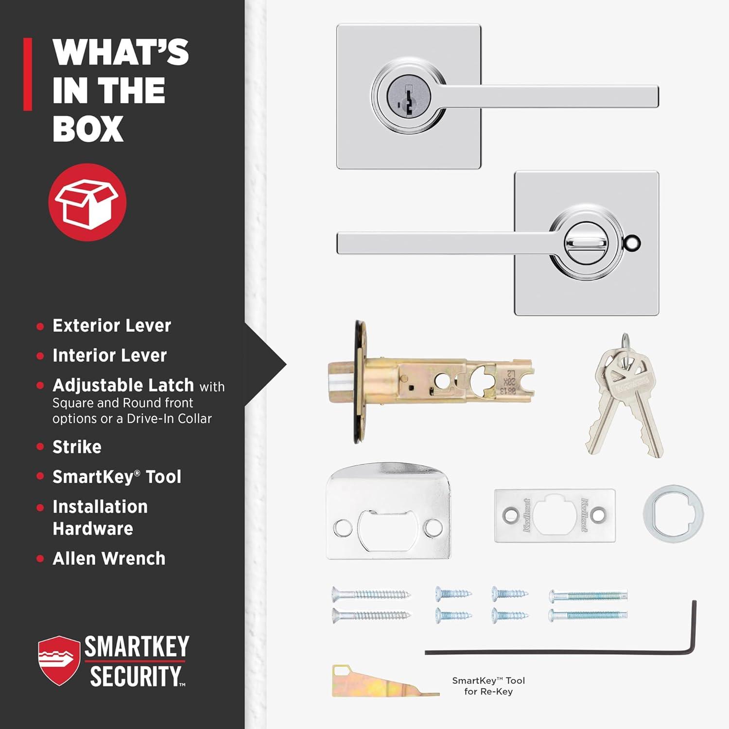 BOX INCLUDES: Entry levers, latch with round and square front options or drive-in collar, strike, SmartKey tool, 2 Kwikset keys, rosette, screws and Allen wrench