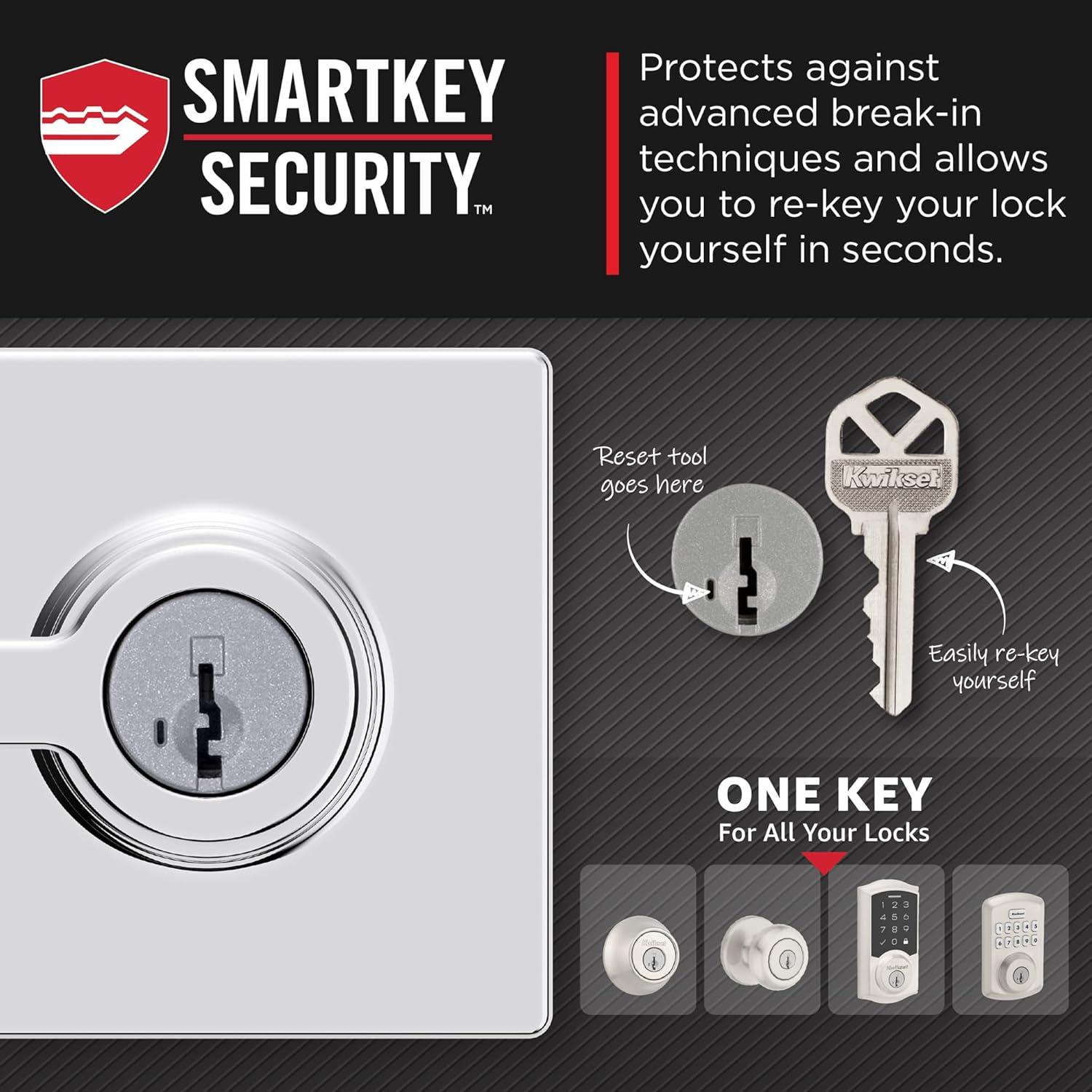 SMARTKEY SECURITY: Kwikset’s SmartKey Security technology protects against advanced break-in techniques and allows you to re-key your lock yourself in seconds