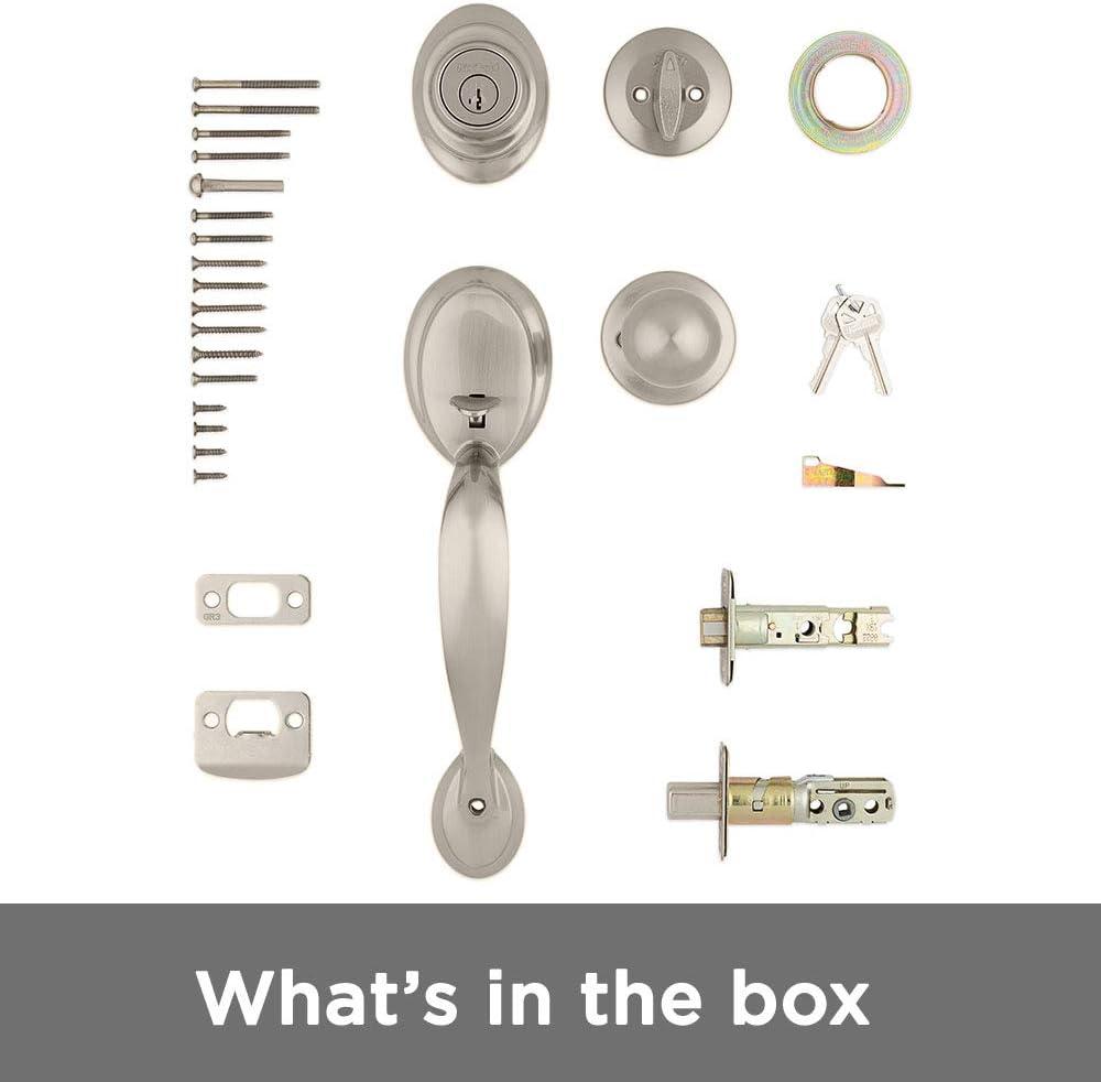 BOX INCLUDES: Exterior Keyed Deadbolt, Handleset, Interior Turn Piece, Interior Lever, Adjustable Latch, 2 Keys, Screws, Strike Plate, SmartKey Tool, Installation Hardware, Install Guide