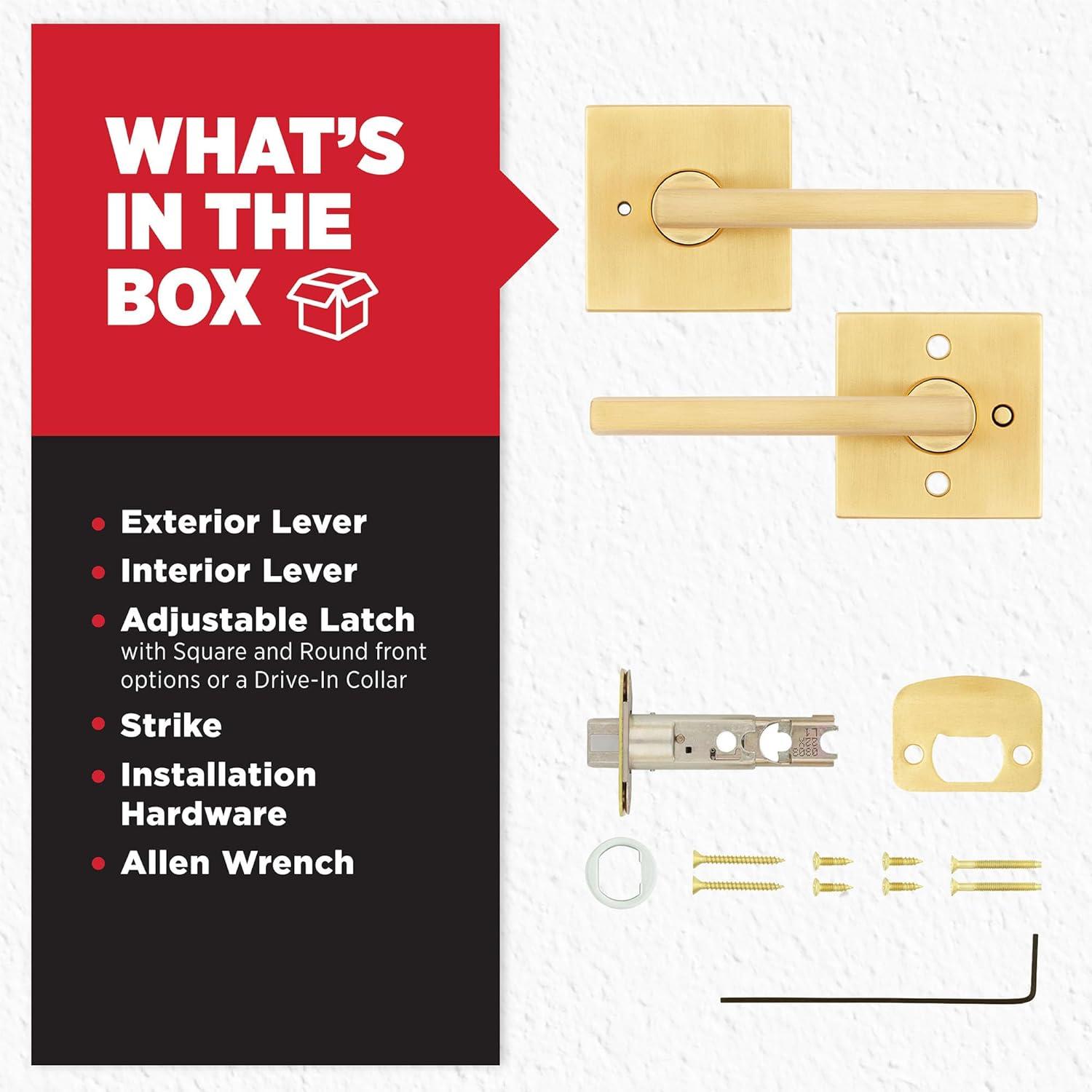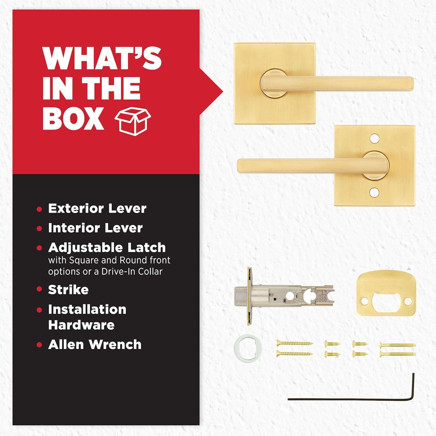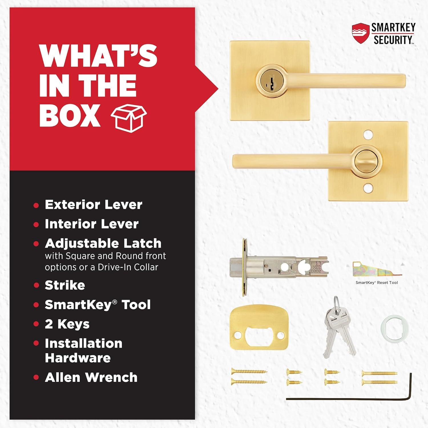 BOX INCLUDES: Exterior Keyed Door Lever, Interior Lever, Adjustable Latch, Intallation Hardware, SmartKey Tool, 2 Keys, Install Guide