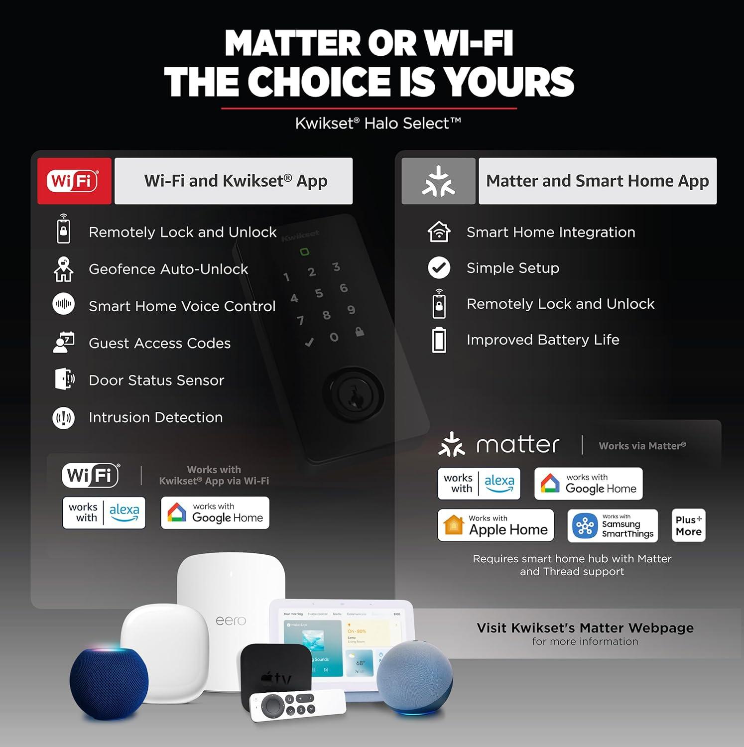 Meet Halo Select, the smart lock that brings convenience, connectivity and security to your front door. Use the full-featured Kwikset app to lock or unlock your home from anywhere, or choose to add Halo Select to your smart home via Matter for a seamless one-app experience. Keyless entry means you can ditch your keys, for good — unlock your door with the Kwikset app or touchscreen, or let geofence technology unlock the door for you when arriving home. Sharing access with family and trusted guests is simple with the Kwikset app, and real-time notifications gives you peace of mind they’ve locked up after leaving. Experience total control of your front door: Control your lock with your voice, check the event log any time and receive instant notifications for intrusion attempts. The interactive guided setup makes it easy to get started with Halo Select, and installation only requires a screwdriver. When it comes to security and access control, you can trust Kwikset’s 75 years of experience to deliver effortless protection and peace of mind.