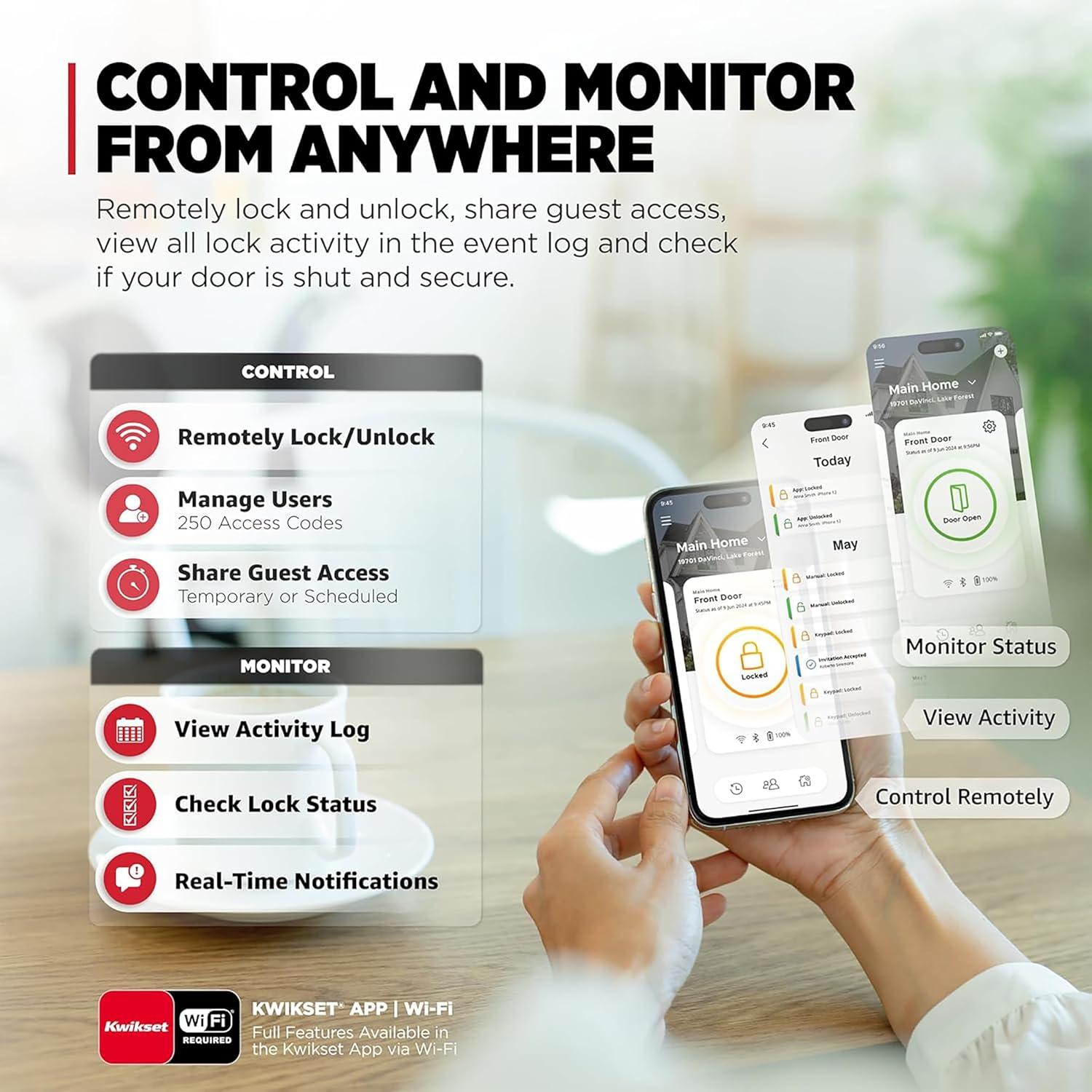 CONTROL AND MONITOR FROM ANYWHERE: Remotely lock and unlock, share guest access and ensure your door is secure using Wi-Fi connectivity (no hub required)
