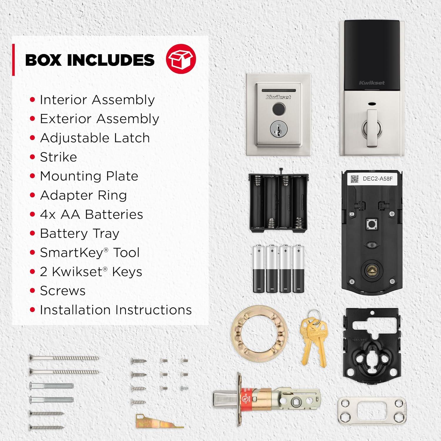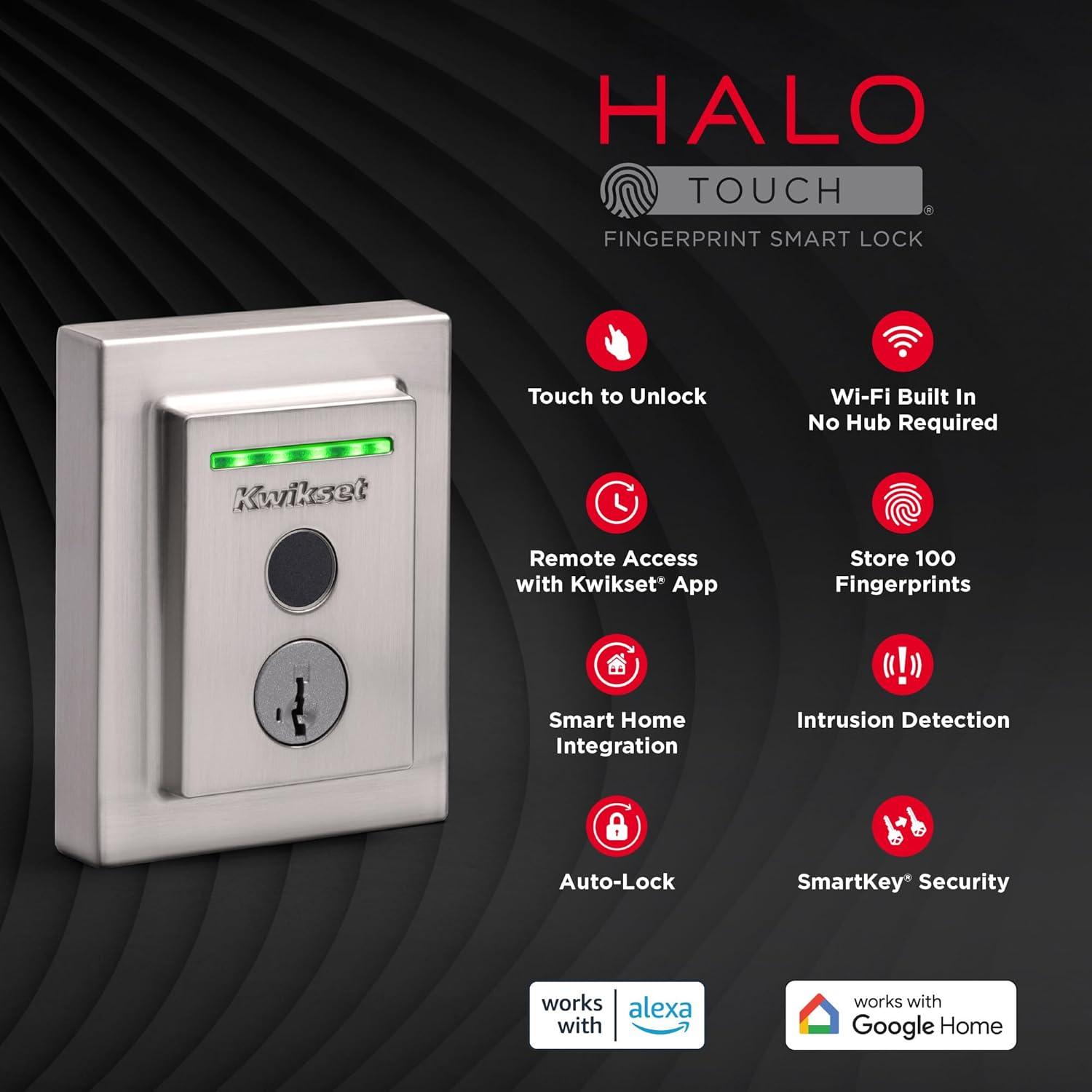 imageKwikset Halo Touch Fingerprint WiFi Smart Lock Keyless Entry Door Low Profile Deadbolt Geofence AutoUnlock Grade AAA Certified No Hub Easy Install Matte Black Lifetime Finish Warranty SquareSatin Nickel