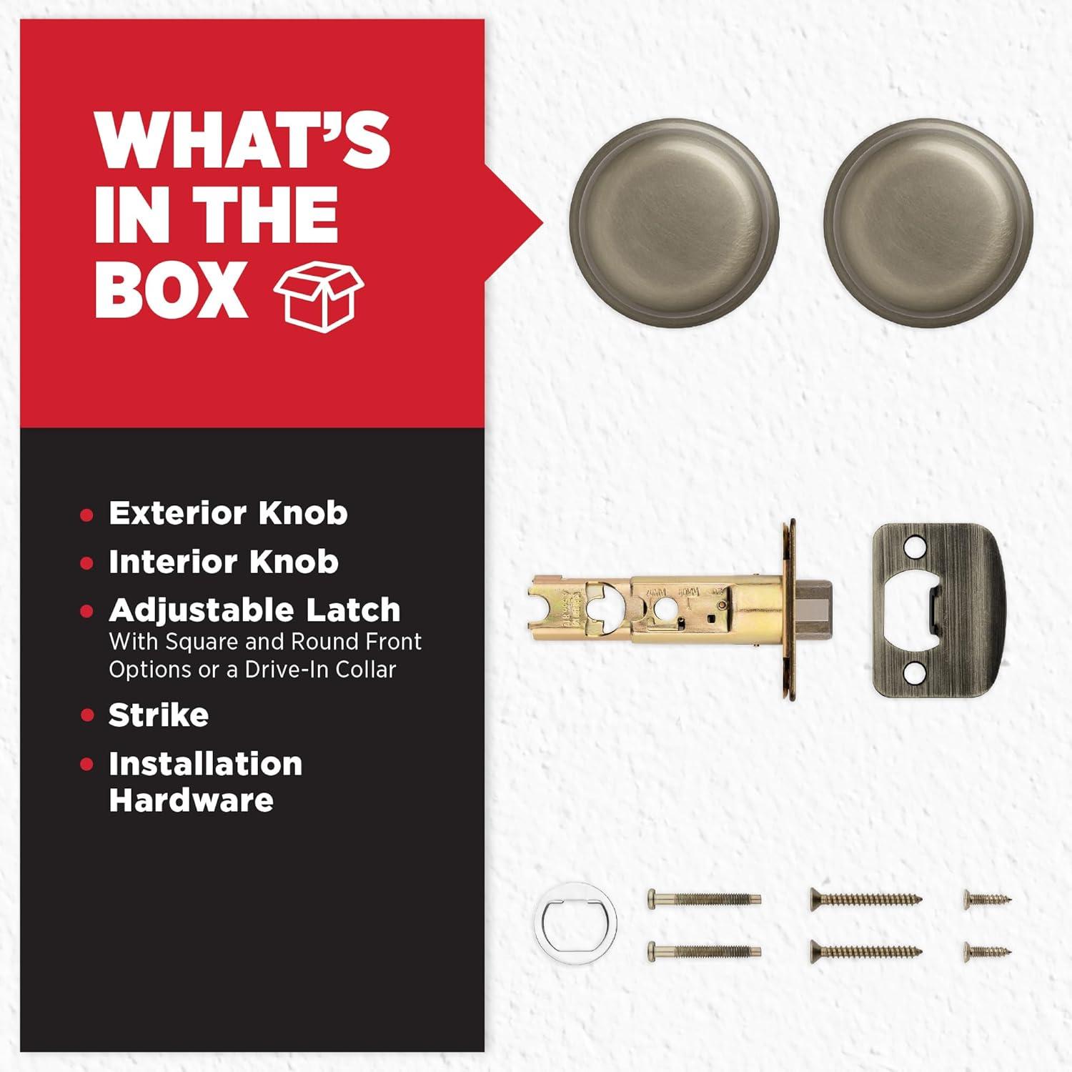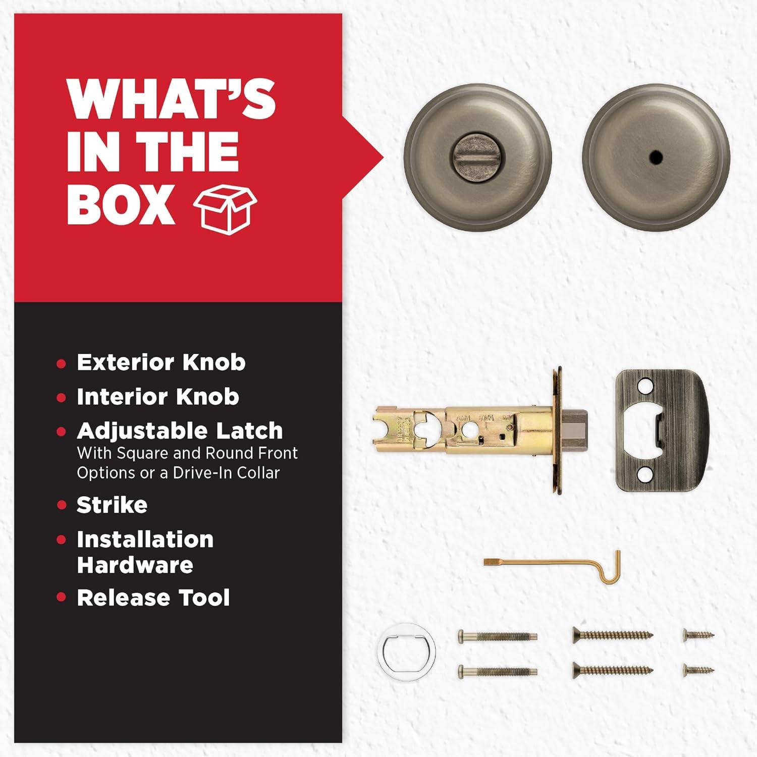 BOX INCLUDES: Keyed Exterior Knob, Interior Knob, Screws, Adjustable Latch, 2 Keys, Strike Plate, SmartKey Tool, Installation Hardware, Install Guide