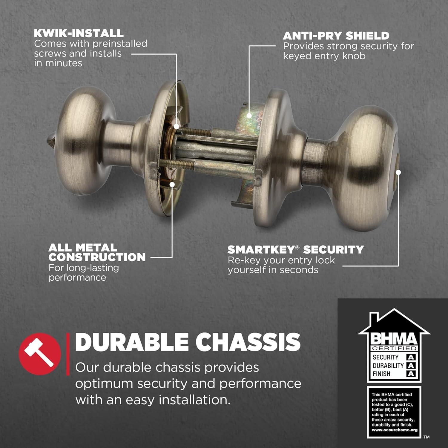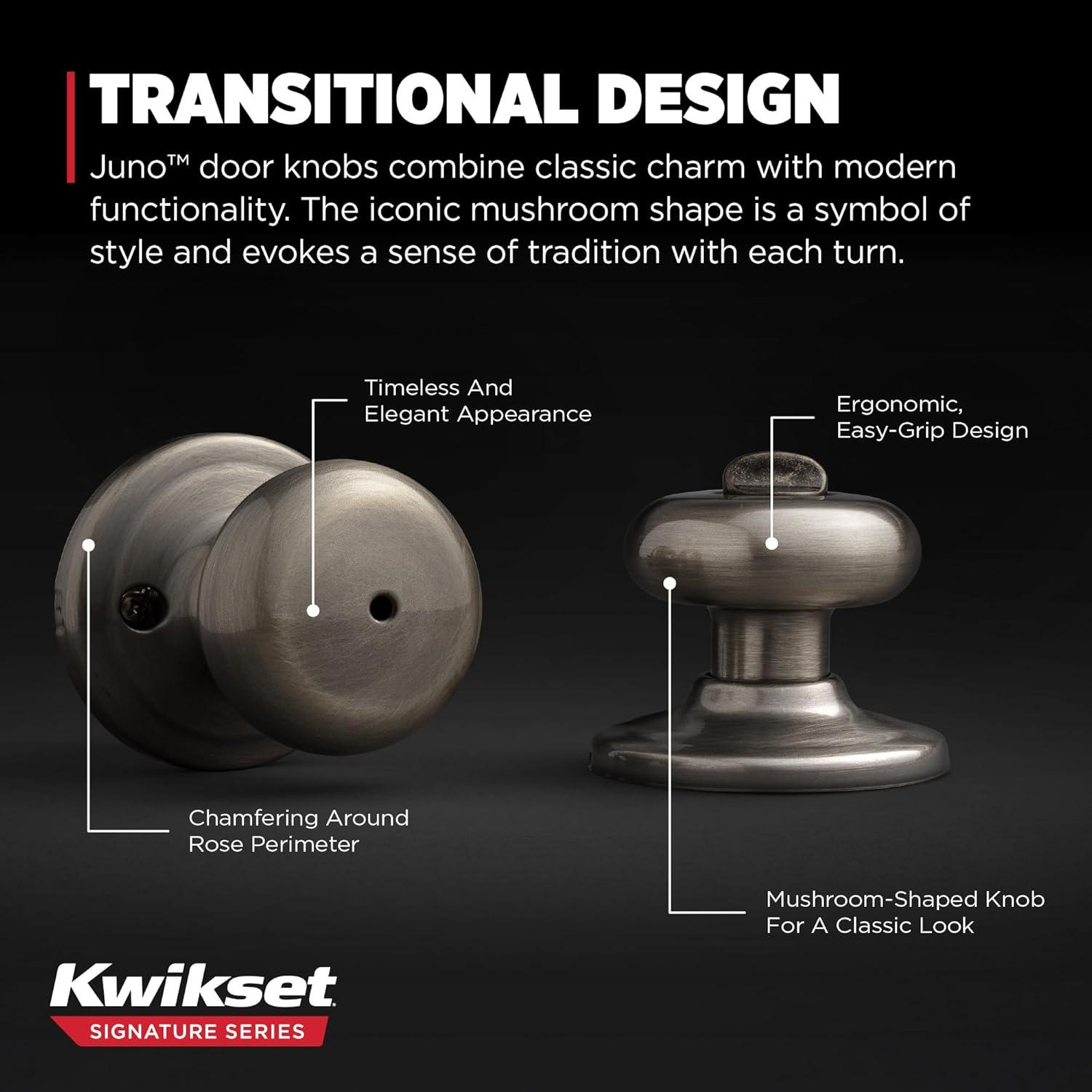 The Signature Series Juno entry knob features Kwikset's revolutionary SmartKey re-key technology, allowing you to exercise strict control over who has access to your home. The SmartKey cylinders feature a stainless steel side locking bar, racks, and pins for increased strength and security, and patented side locking bar technology offers improved security by protecting against lock bumping, an attack technique used to defeat conventional pin and tumbler locks.