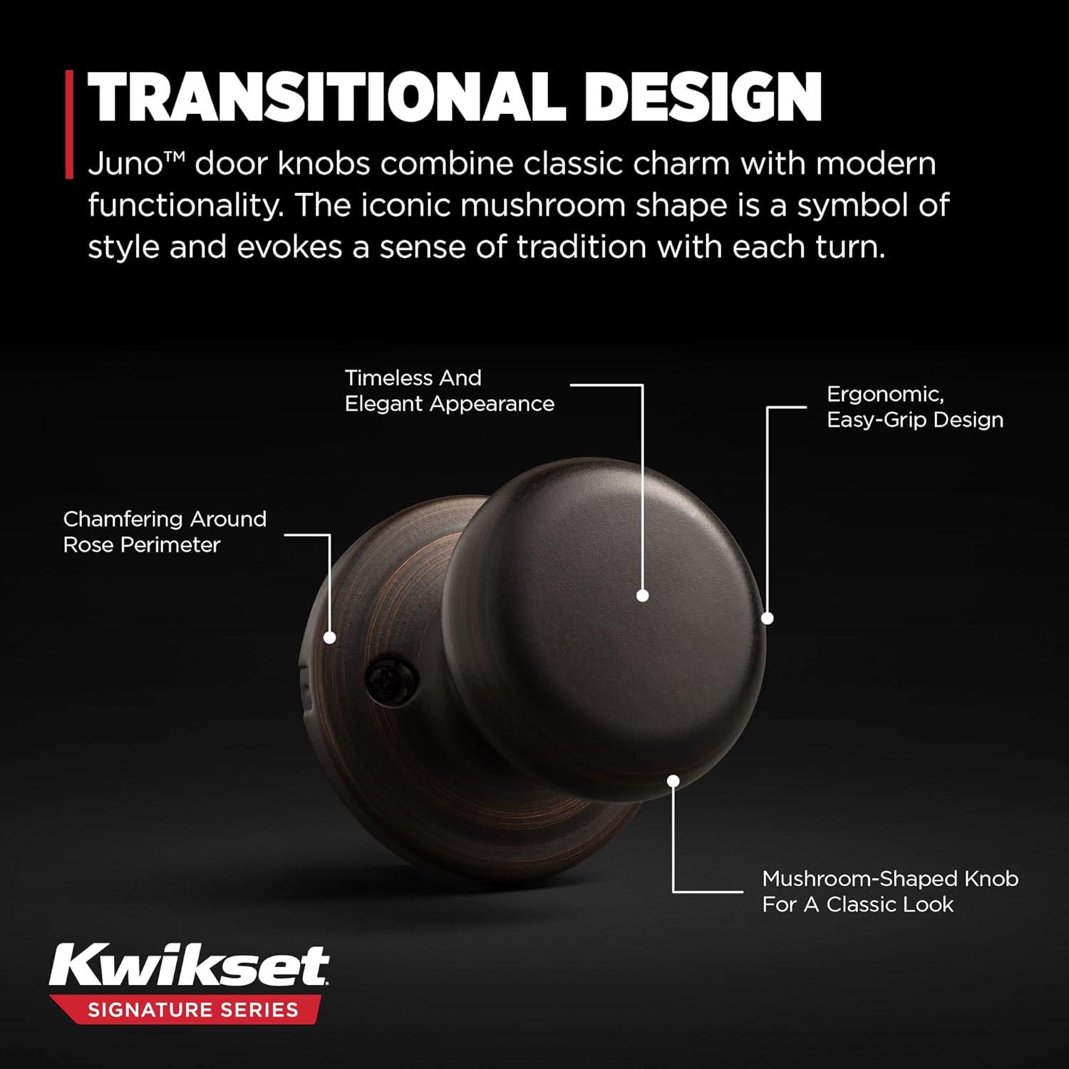 The Signature Series Juno entry knob features Kwikset's revolutionary SmartKey re-key technology, allowing you to exercise strict control over who has access to your home. The SmartKey cylinders feature a stainless steel side locking bar, racks, and pins for increased strength and security, and patented side locking bar technology offers improved security by protecting against lock bumping, an attack technique used to defeat conventional pin and tumbler locks.