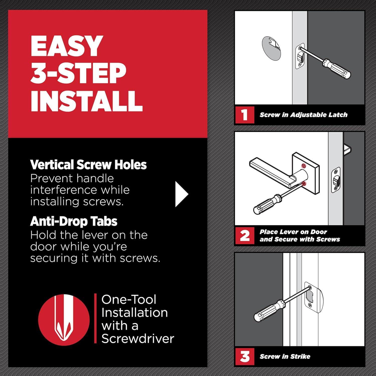 EASY INSTALL REVERSIBLE LEVER: Do it yourself, installs in minutes with just a screwdriver. Reversible handle for left- or right-handed doors, detailed directions provided
