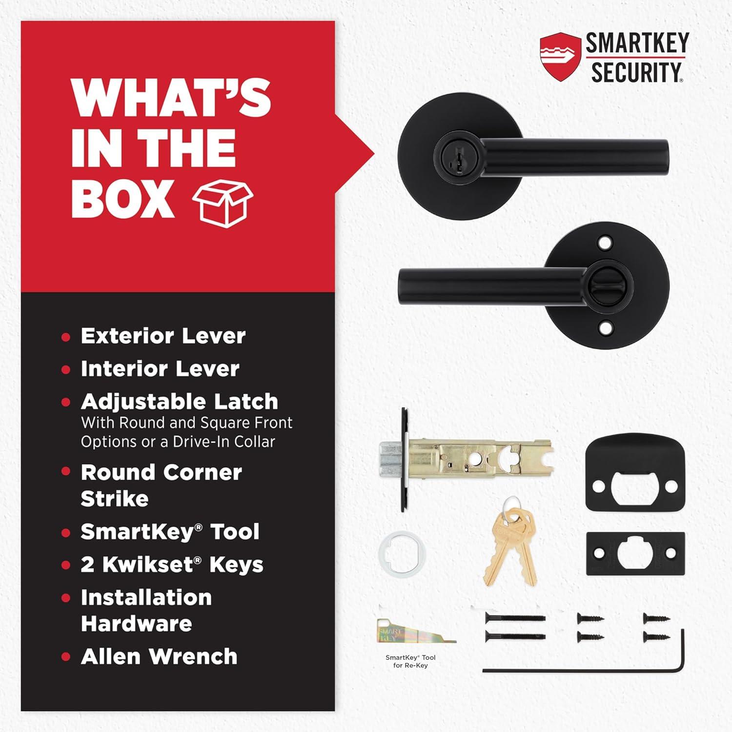 BOX INCLUDES: Exterior Keyed Door Lever, Interior Lever, Adjustable Latch, Intallation Hardware, SmartKey Tool, 2 Keys, Install Guide