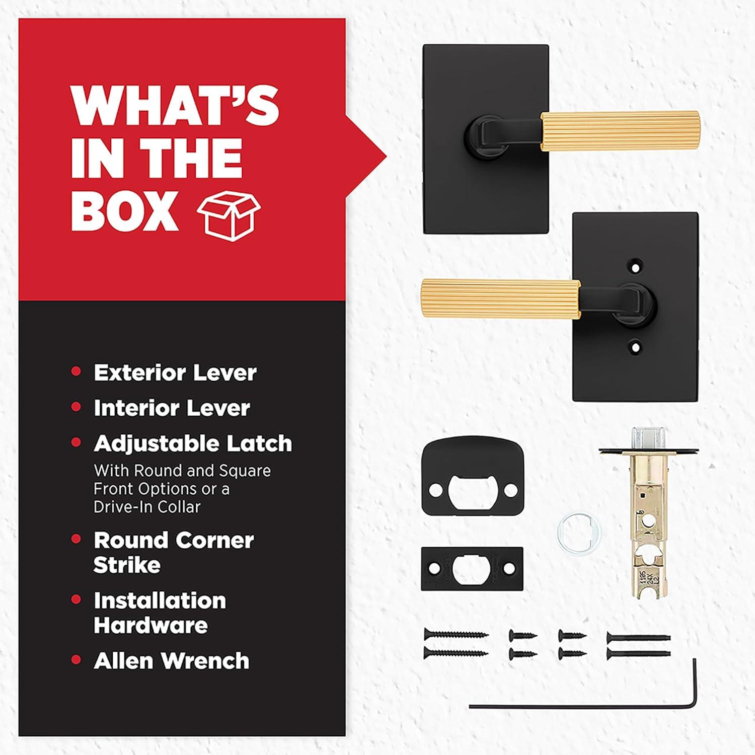 BOX INCLUDES: Passage lever, adjustable latch with round front option or a drive-in collar, round corner strike, installation hardware and Allen wrench