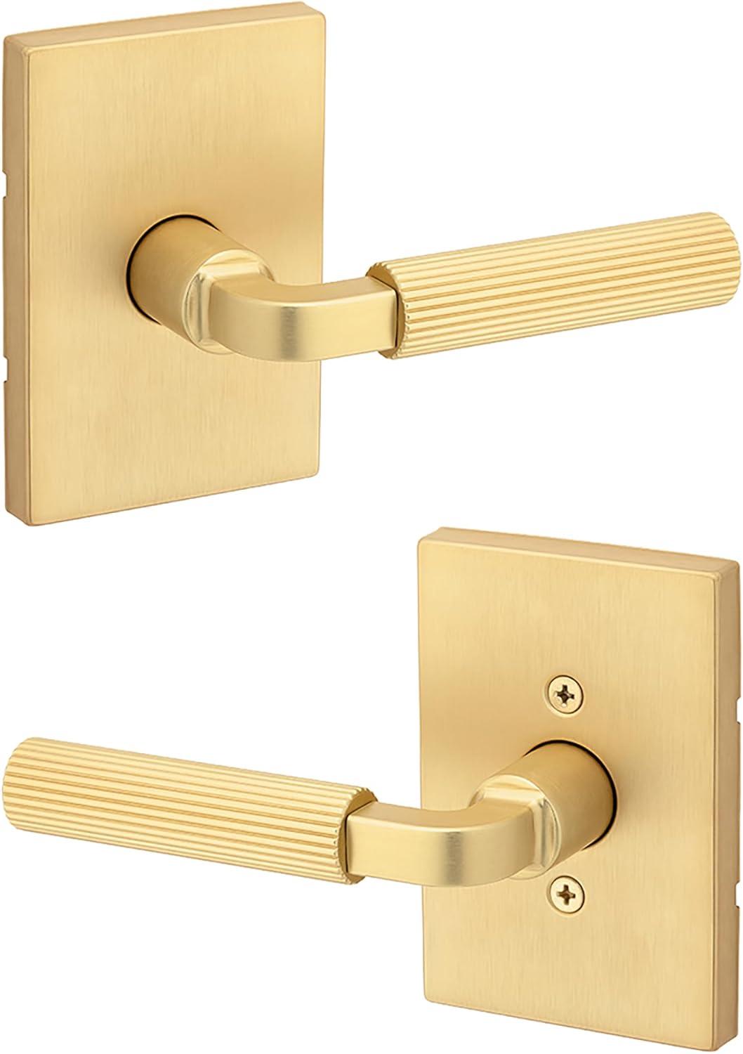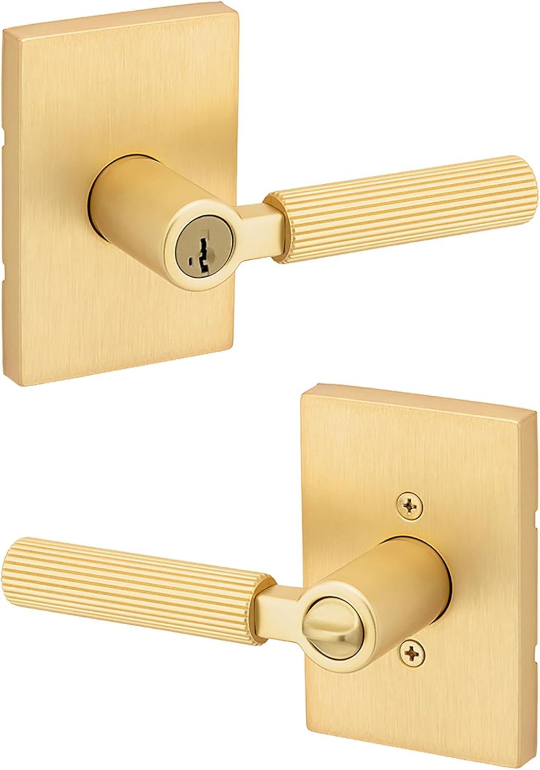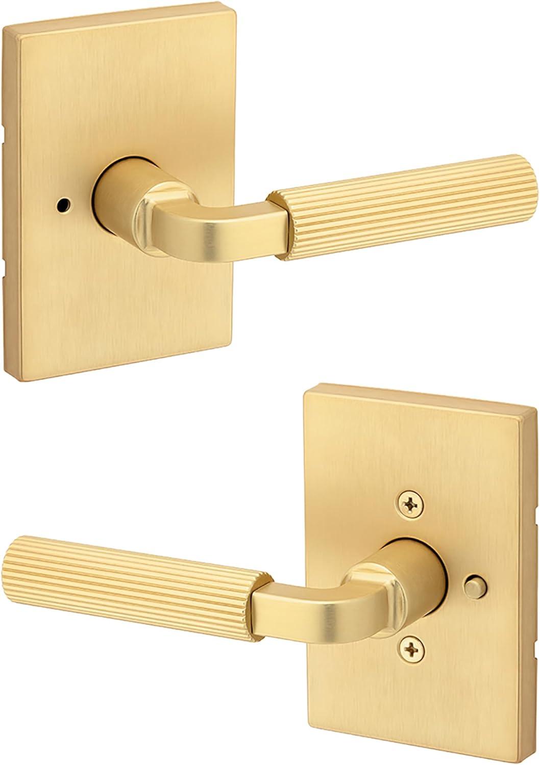 Kwikset Mirada Reeded Interior Privacy Door Handle with Lock, Handle for Bathroom and Bedroom, Satin Brass, Reversible Keyless Push Button Lock, with Microban Protection(Satin Brass)