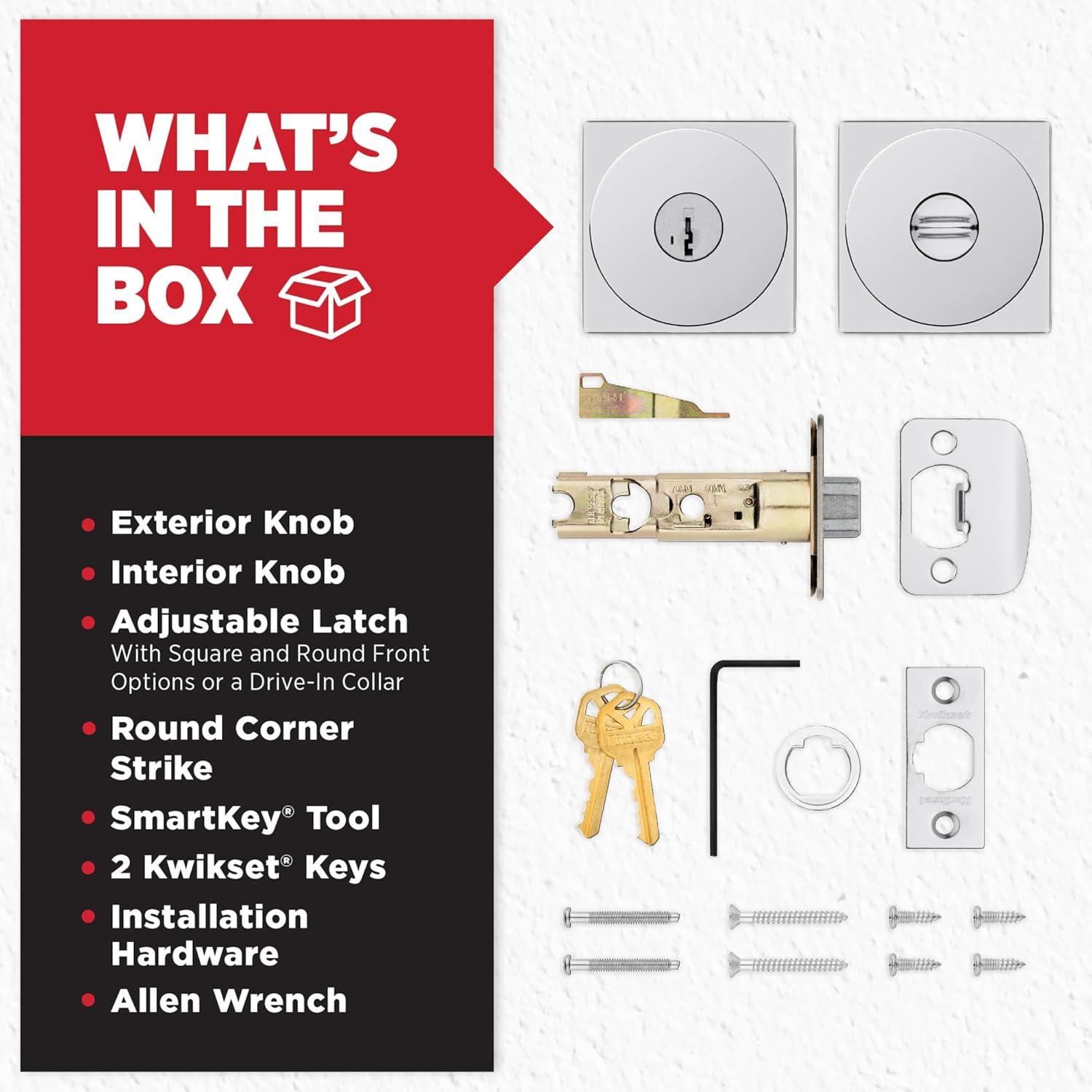 BOX INCLUDES: Keyed Exterior Knob, Interior Knob, Screws, Adjustable Latch, 2 Keys, Strike Plate, SmartKey Tool, Installation Hardware, Install Guide