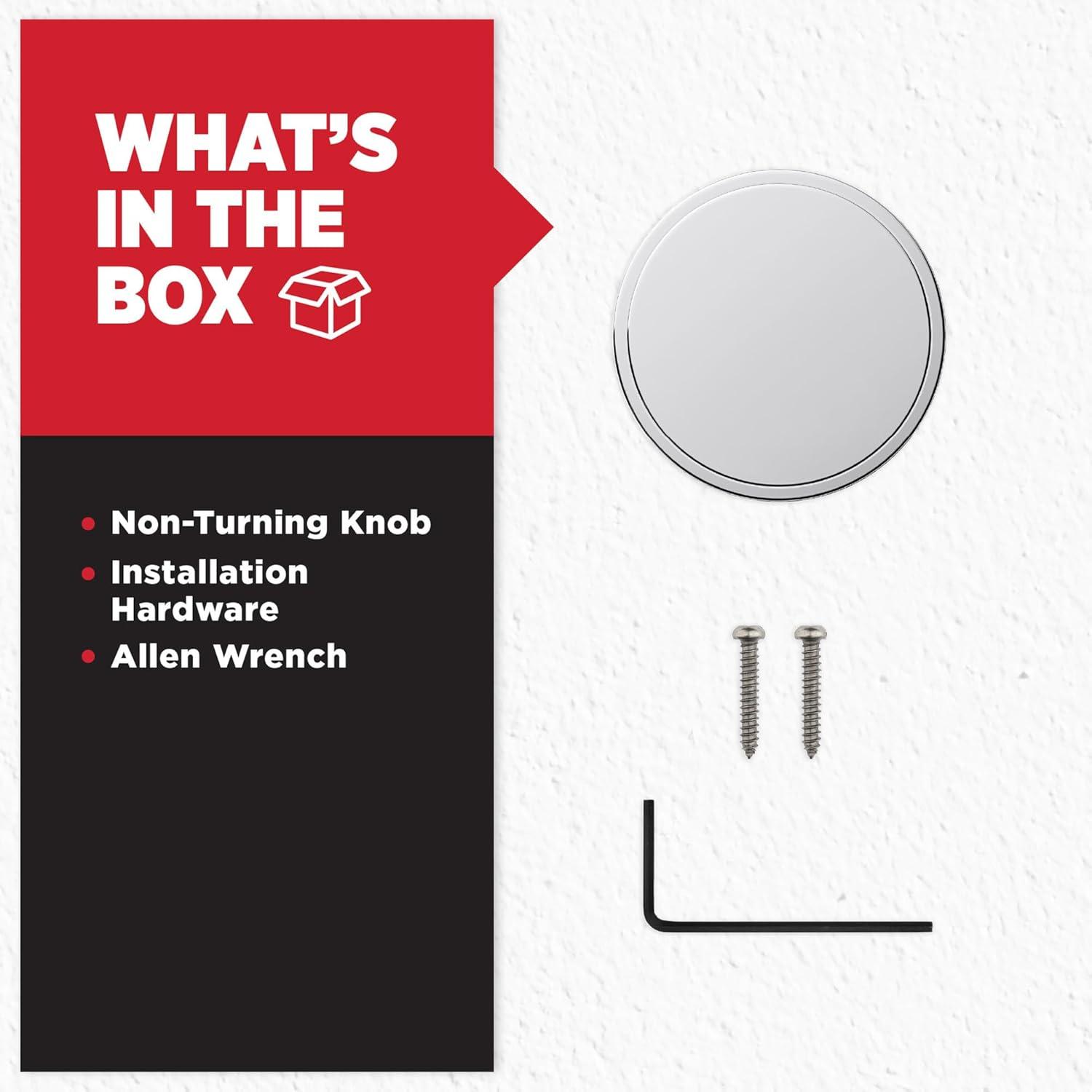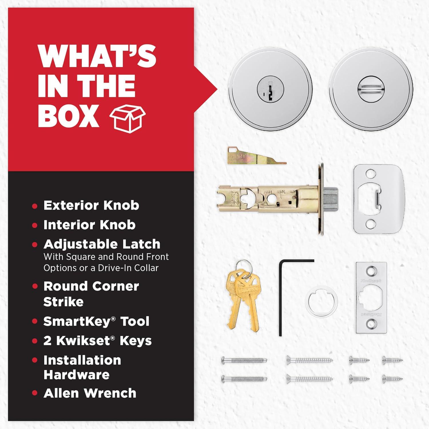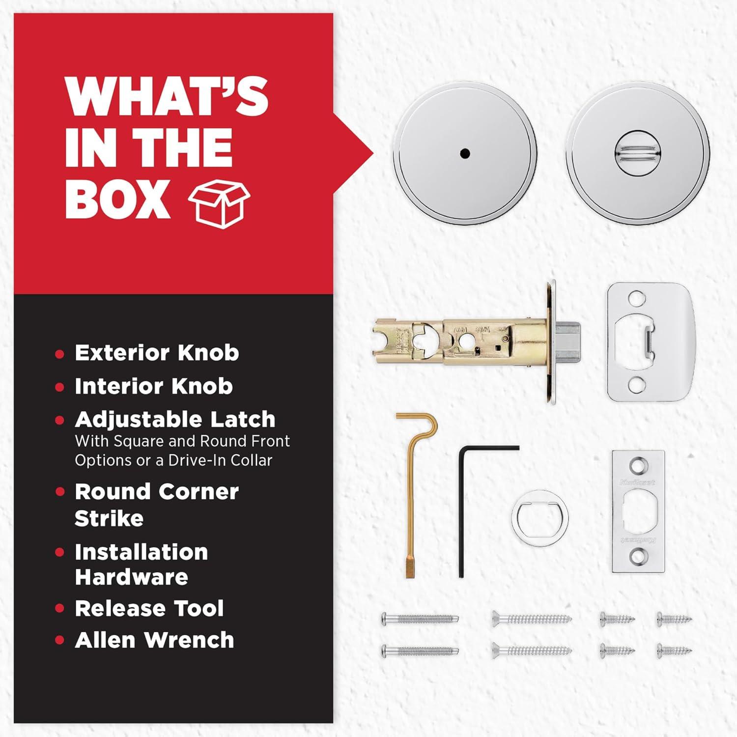BOX INCLUDES: Exterior and Interior Knobs, Screws, Adjustable Latch, Strike Plate, Installation Hardware, Install Guide