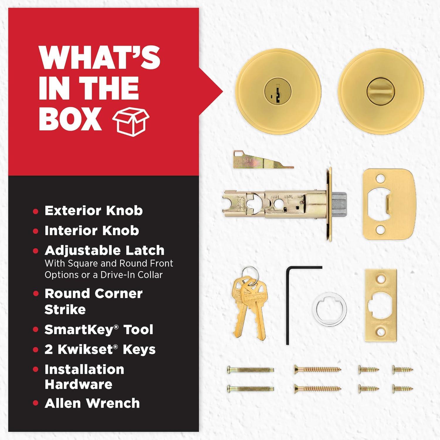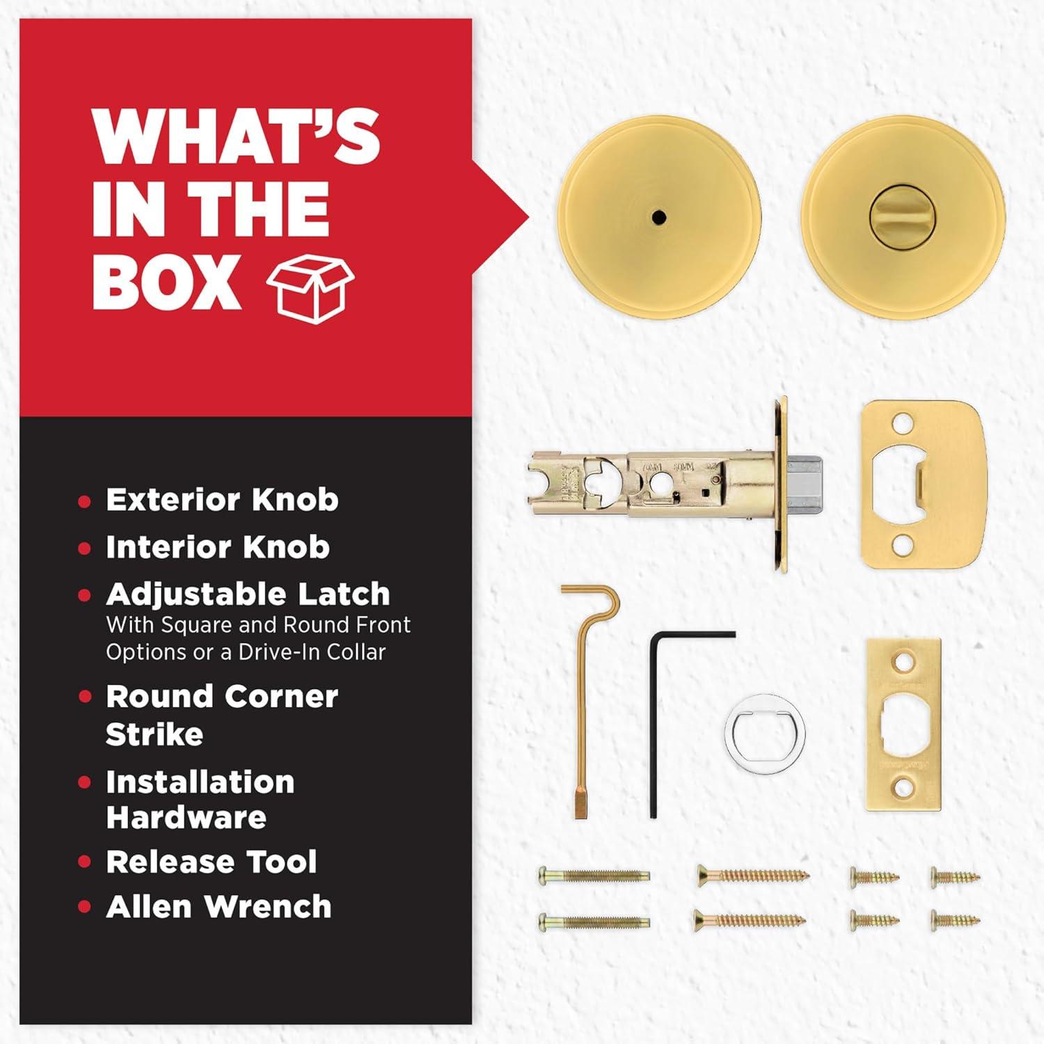 BOX INCLUDES: Exterior and Interior Knobs, Screws, Adjustable Latch, Strike Plate, Installation Hardware, Install Guide