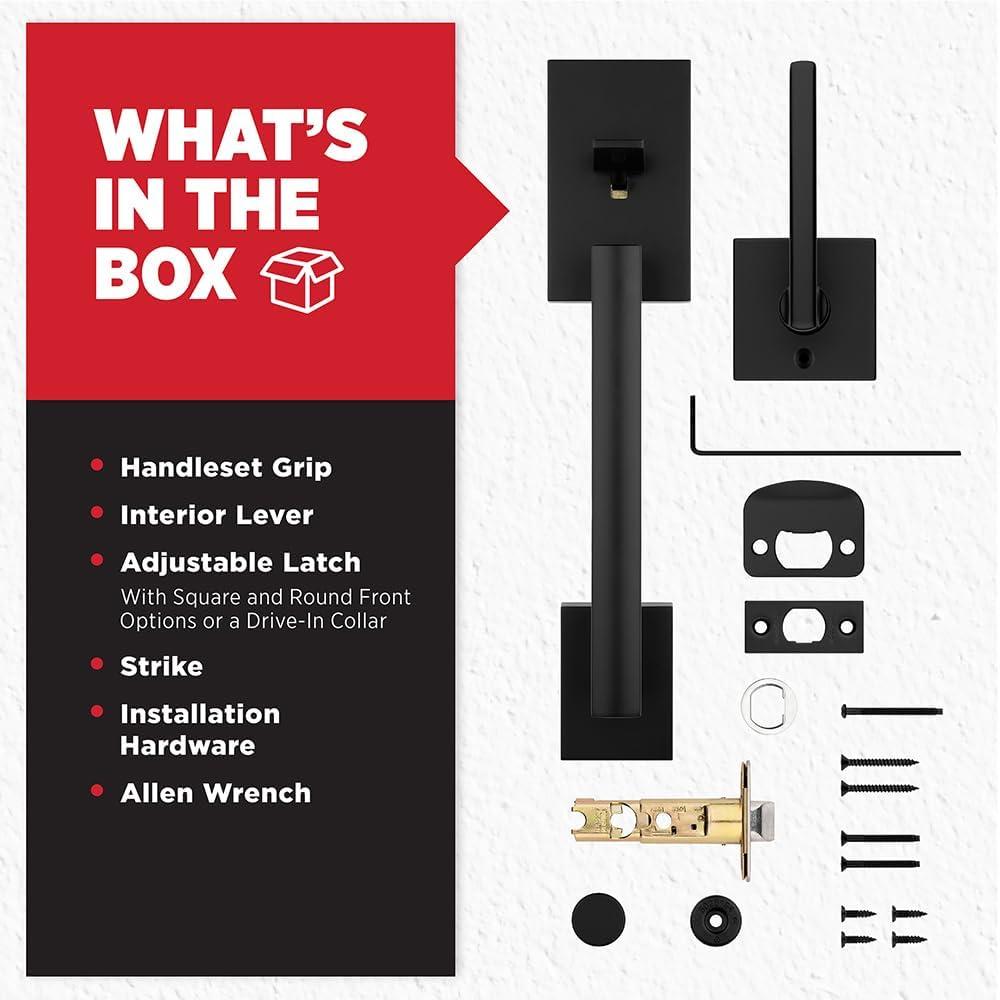 BOX INCLUDES: Handleset, Interior Lever, Adjustable Latch, Screws, Strike Plate, Installation Hardware, Install Guide