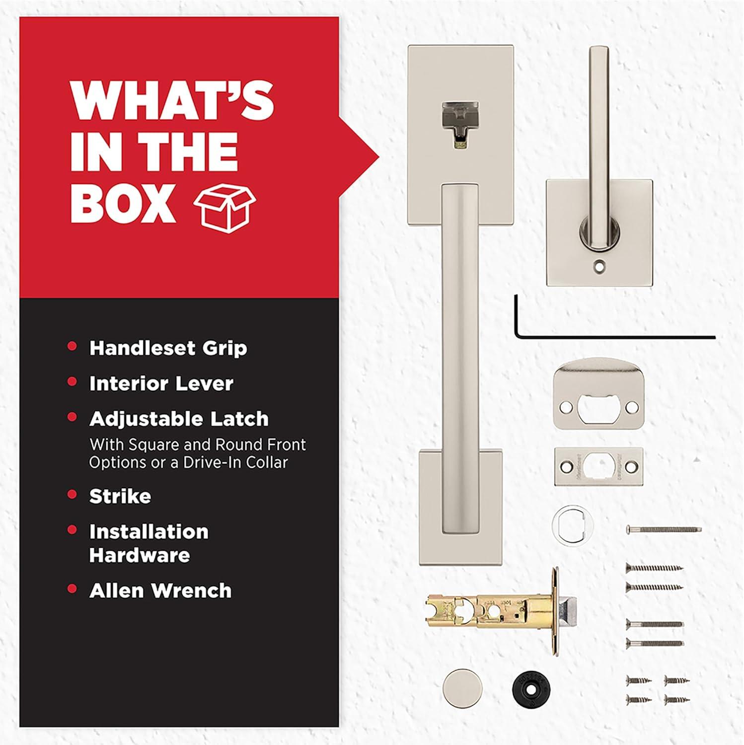 BOX INCLUDES: Handleset, Interior Lever, Adjustable Latch, Screws, Strike Plate, Installation Hardware, Install Guide