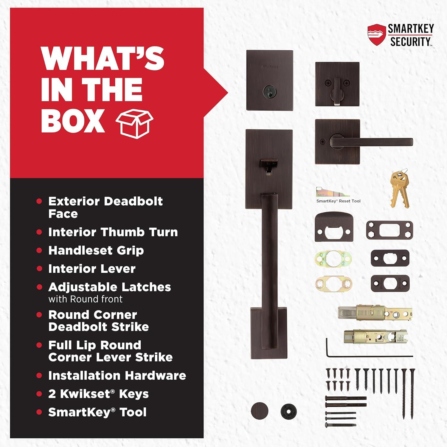 BOX INCLUDES: Exterior Keyed Deadbolt, Handleset, Interior Turn Piece, Interior Lever, Adjustable Latch, 2 Keys, Screws, Strike Plate, SmartKey Tool, Installation Hardware, Install Guide