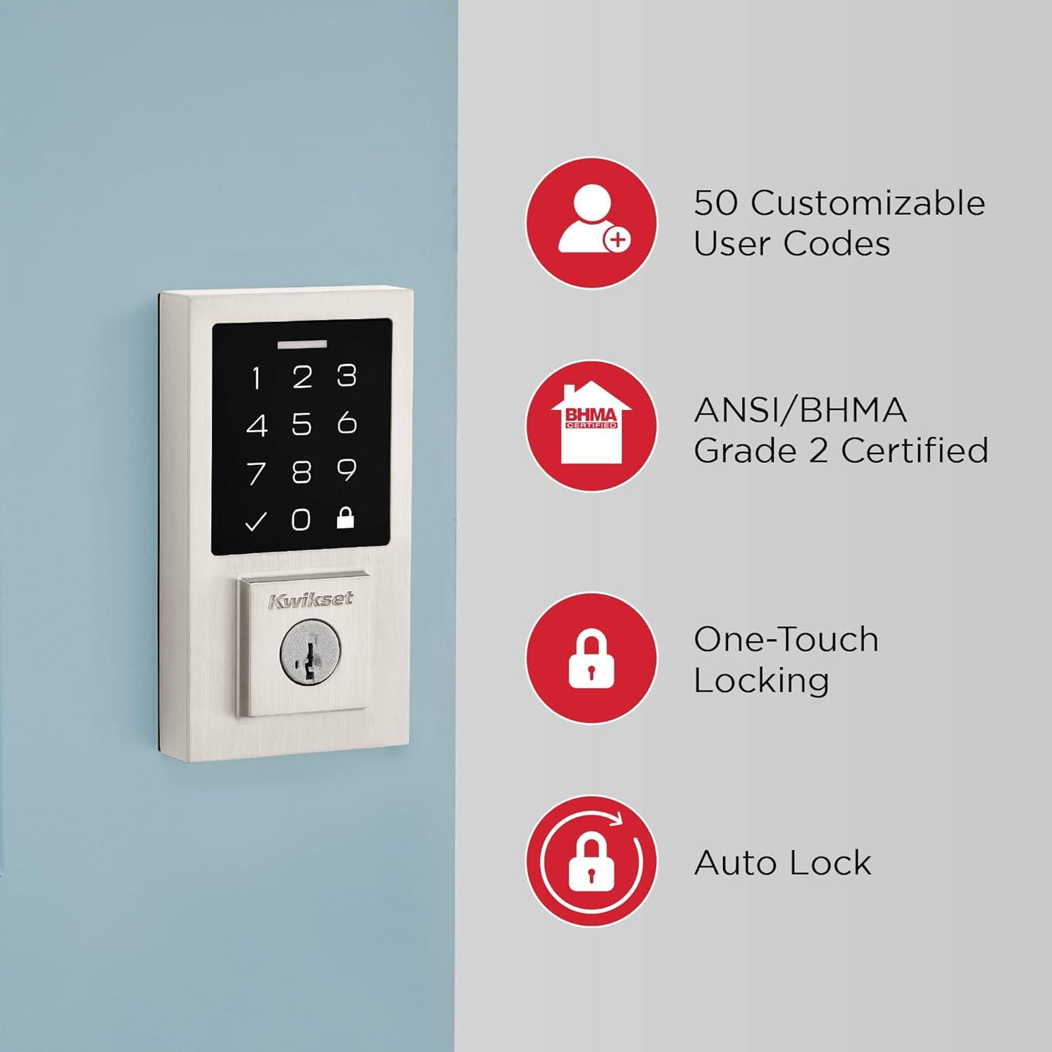 Upgrade to keyless convenience and advanced security with the Kwikset SmartCode 270 Electronic Door Lock. The light-up touchpad and 50 customizable user codes simplify entry for you, your family and trusted guests. With a Grade 2 BHMA certification, it delivers reliable security and functionality, withstands the elements and is up to 2.5 times stronger than Grade 3 locks. Enjoy peace of mind with customizable, automatic locking and an easy installation that only requires a screwdriver.