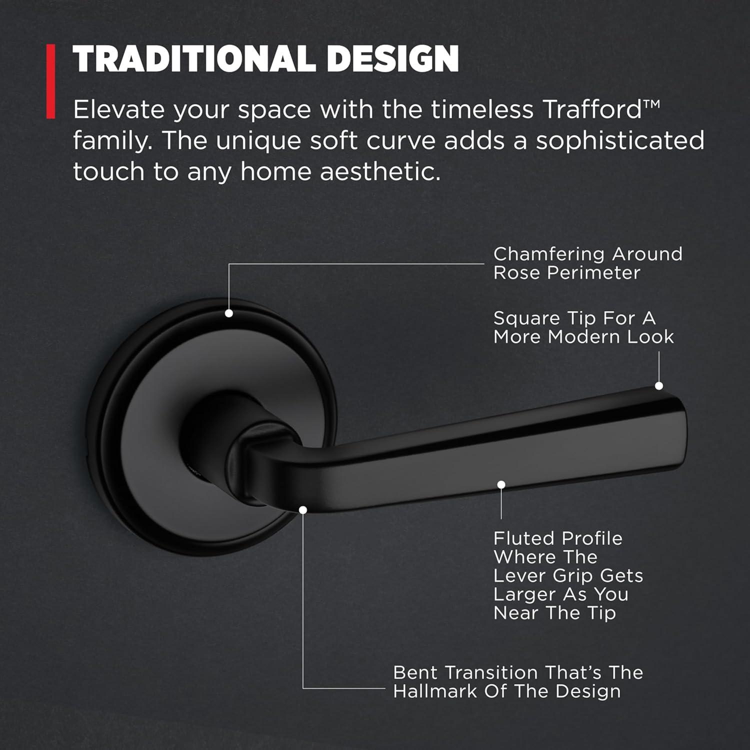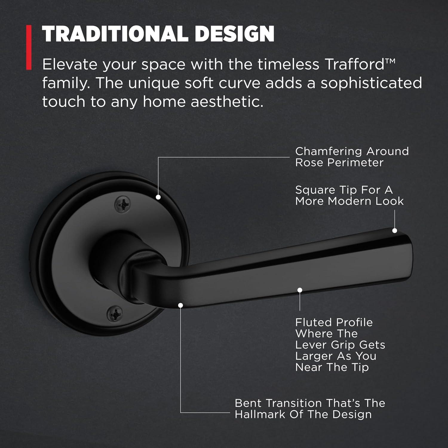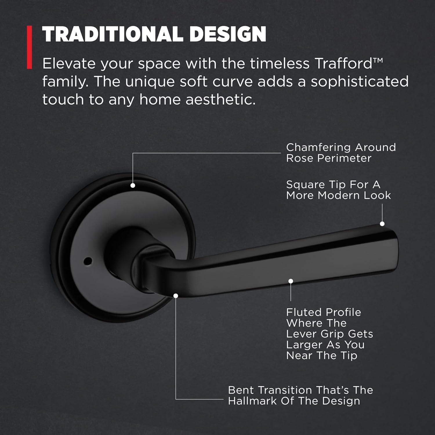 Step up to designer styles and superior security with Kwikset Signature Series products. Elevate your space with the timeless Trafford family. The unique soft curve adds a sophisticated touch to any home aesthetic, while the designer rosette imparts a warm and welcoming feel to your doors. Create your desired look with three premium finishes, then let our bump- and pick-resistant SmartKey Security protect what matters most. Adorn your interior and exteriors with Trafford levers, and enjoy our highest level of security, easiest installation and peace of mind. This passage lever is best used on interior hall and closet applications where no locking is required, so the lever is always free to turn. The lever is reversible and mounts on both left and right handed doors. The rich tones of Matte Black add the finishing touch to this product. The Matte Black finish provides a rich and warm complement to the product’s style.