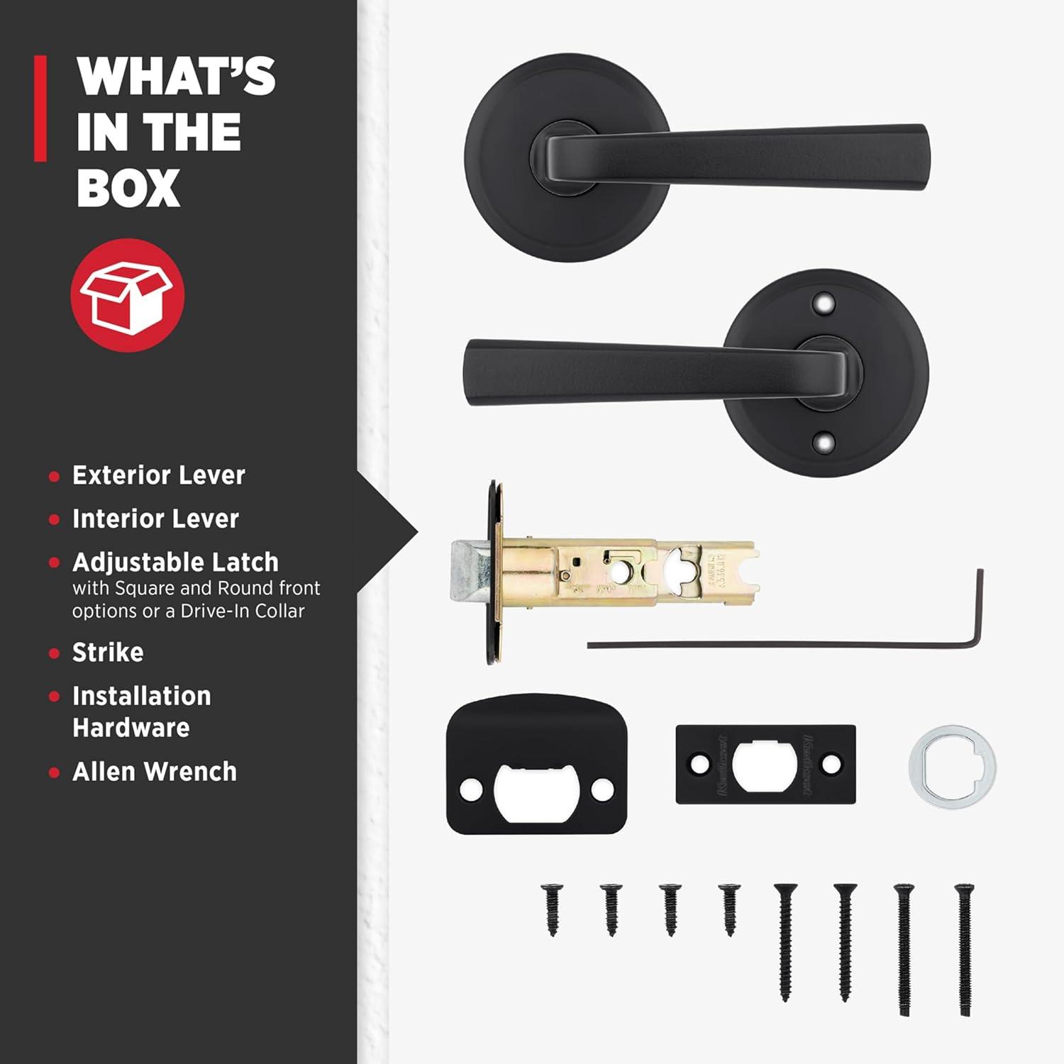 BOX INCLUDES: Passage lever, adjustable latch with round and square front options or drive-in collar, round corner strike, rosette, screws and Allen wrench