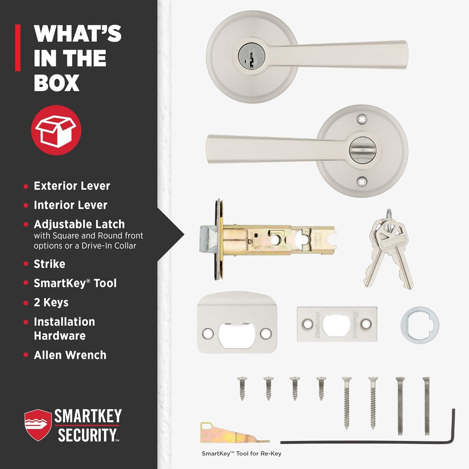BOX INCLUDES: Passage lever, adjustable latch with round and square front options or drive-in collar, round corner strike, rosette, screws and Allen wrench