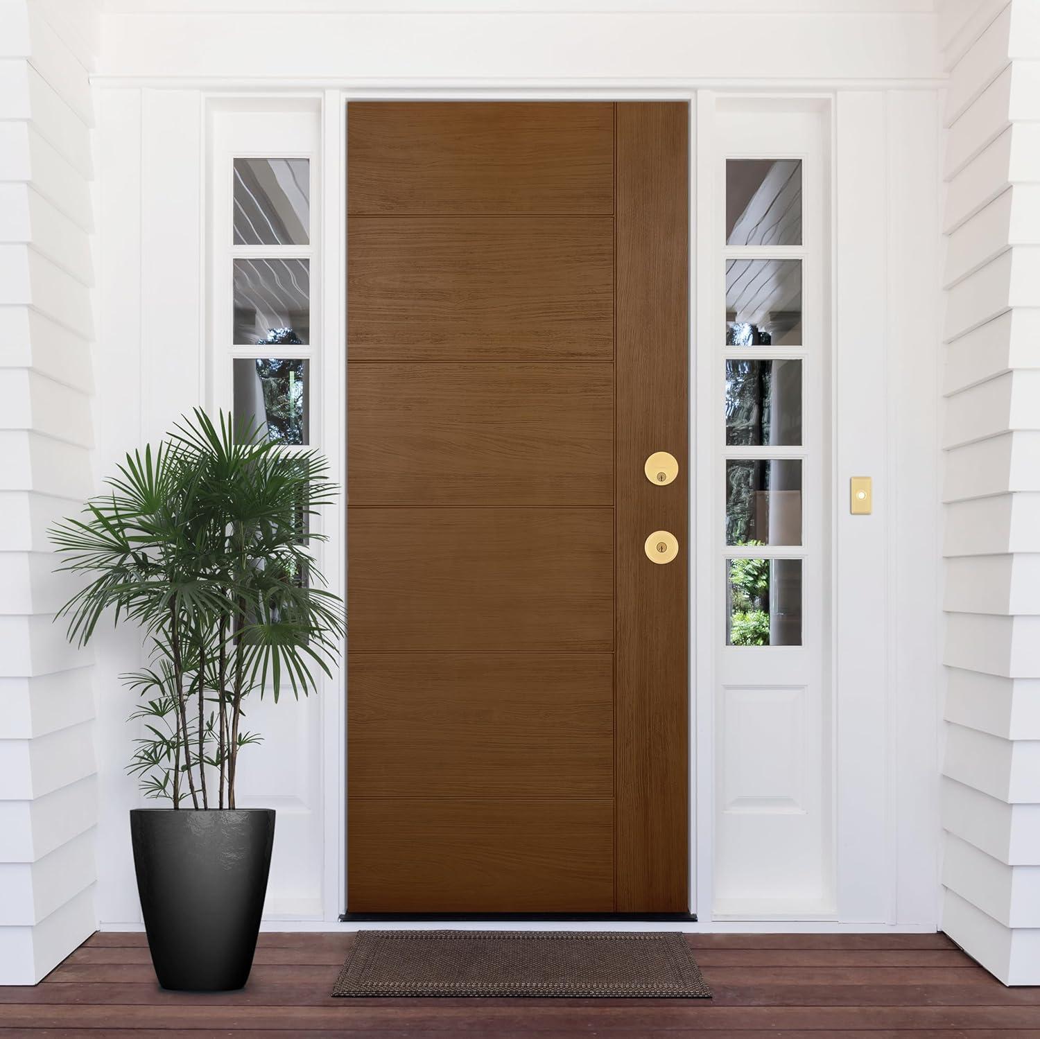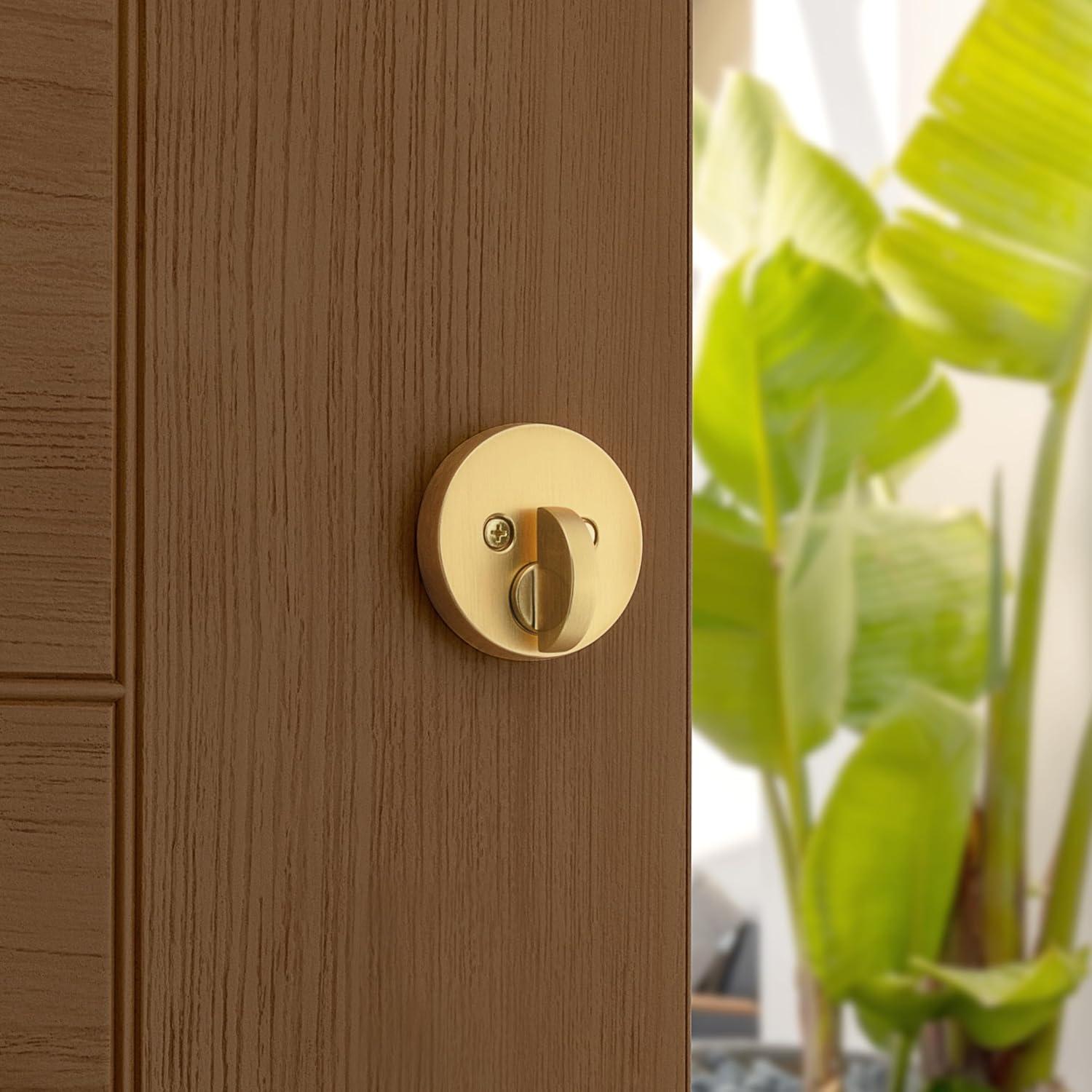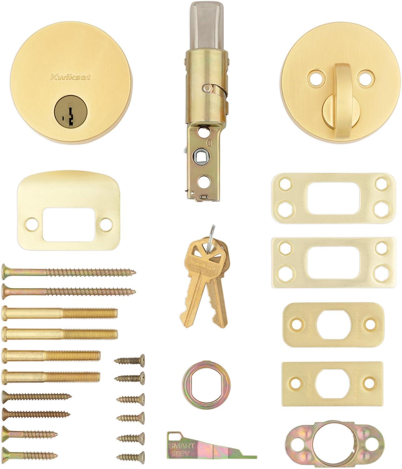 Step up to designer styles and superior security with Kwikset Signature Series products. This single cylinder deadbolt is operated by a key on the outside or a thumb turn on the inside. The textured finish of Satin Brass gives it a refined, rustic look.
